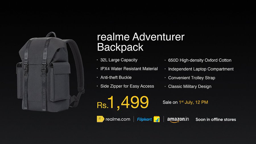 The Realme Adventurer Backpack costs Rs 1499 in India. It will be available on Realme.com, Flipkart and Amazon starting July 1, 2020 12 PM.