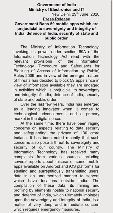 A government press release announcing the ban stated: “The Ministry of Information Technology, invoking it’s power under section 69A of the Information Technology Act read with the relevant provisions of the Information Technology (Procedure and Safeguards for Blocking of Access of Information by Public) Rules 2009 and in view of the emergent nature of threats has decided to block 59 apps
